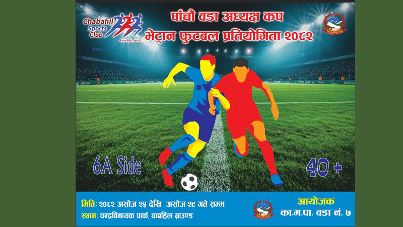 काठमाडौं महानगरपालिका वडा ७ को आयोजनामा हुने पाँचौं वडा अध्यक्ष कप भेट्रान फुटबल प्रतियोगिताको नयाँ मिति सार्वजनिक गरिएको छ । प्रतियोगिता असोज २५ देखि २९ गतेसम्म हुने भएको छ ।…